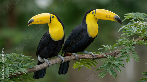 © Chainat, Naklejka premium The Tropical Duo: A stunning shot of two vibrant toucans perched elegantly on a tree branch, showcasing their characteristic large beaks and striking plumage.