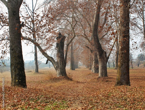 © fabiyan, Fototapeta premium The Tunnel of trees in autumn season in Kashmir .