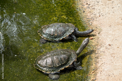 © susan flashman, Fototapeta premium the two long neck turtles are in a pond