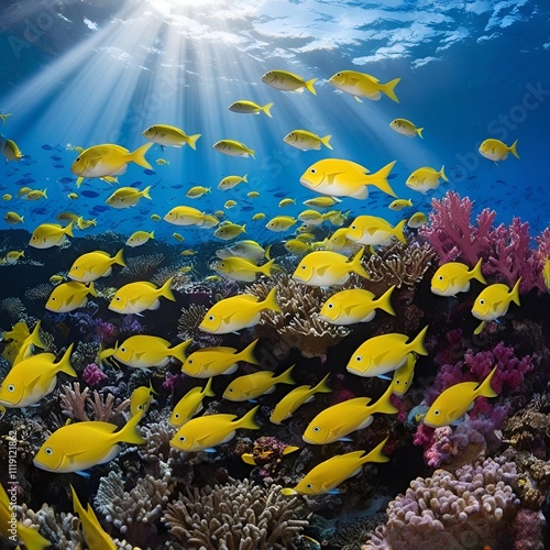 Naklejka premium The underwater realm is a vibrant ribbon of life, colorful coral gardens sway...
