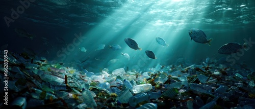 Naklejka premium The underwater scene of fish swimming above plastic pollution in the ocean.