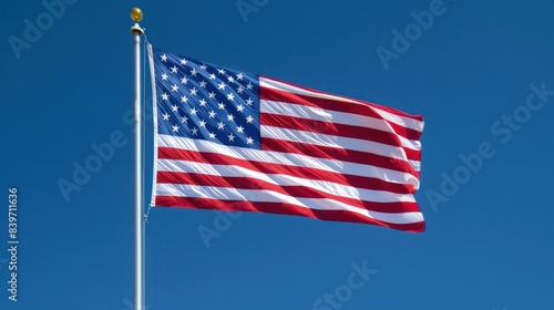 © Matthew, Fototapeta premium The United States flag features stars and stripes, representing the 50 states and 13 original colonies, waving in the wind against a clear blue sky