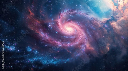 Fototapeta premium The universe stretches out before us from space, revealing a spiral galaxy at the center of a swirling sea of stars and nebulae.