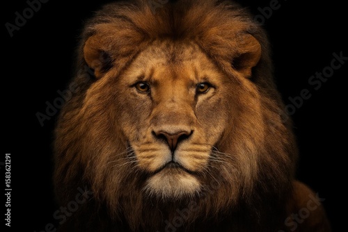 Fototapeta premium The unyielding gaze of a lion against a stark black backdrop