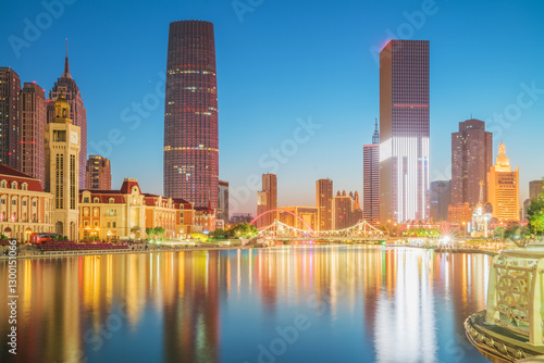 Naklejka premium The urban architectural skyline, modern bridges, and Haihe River night...