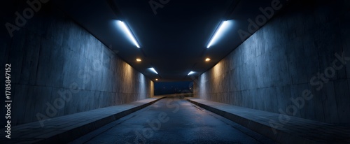 Fototapeta premium The urban underpass feels cold and lonely beneath harsh overhead lighting.