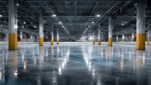 Fototapeta premium The vacant ice rink is lit by bright overhead lights, with yellow support...