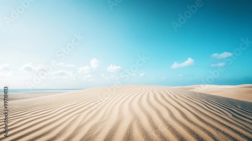 Naklejka premium The vast sand dunes stretch endlessly, their soft curves marked by gentle winds under a bright blue sky, embodying a serene desert landscape