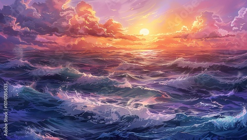 Fototapeta premium The vast sea, rolling waves under the setting sun, features anime style...
