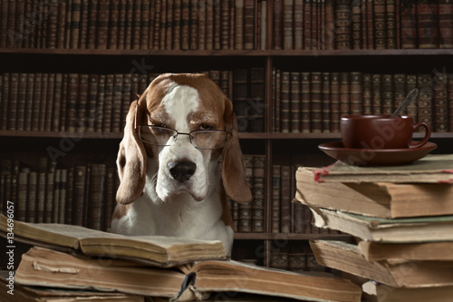© Igor Normann, Naklejka premium The very smart dog studying old books in library