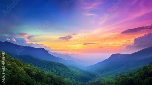 © sa-photo, Fototapeta premium The vibrant Blue Mountains at dusk, with a colorful sky casting shadows on the dense forest-covered valleys below.