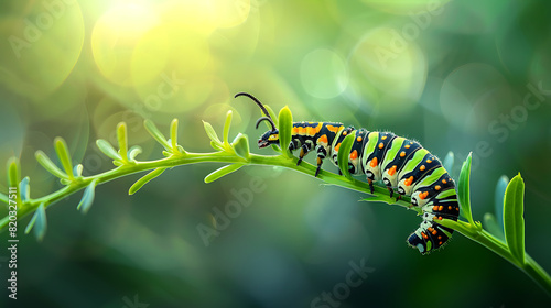 © DigitaArt.Creative, Naklejka premium The vibrant caterpillar crawling on the green stem against a blurred natural background evokes a sense of wonder and curiosity