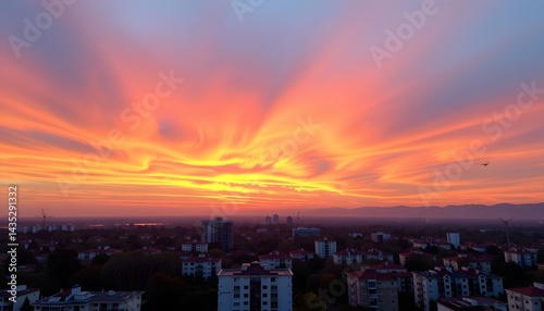 © thammarat, Fototapeta premium The vibrant hues of red, orange, and pink blend together seamlessly in the sky, casting a warm glow over the cityscape below.