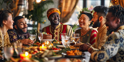 Obraz premium The Vibrant Melting Pot of American Cultures: A diverse group of people, dressed in traditional attire, laughing and enjoying each other's company around a communal dining table.