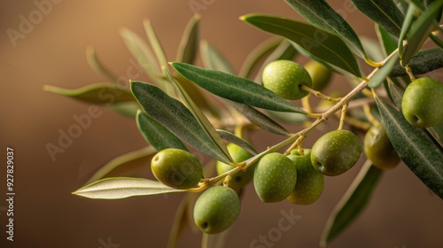 Fototapeta premium The vibrant olive branch showcases numerous green olives against a softly...