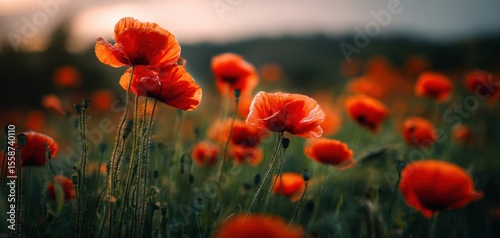 © Bohdana, Obraz premium The vibrant poppies blooming in a scenic sunset landscape.