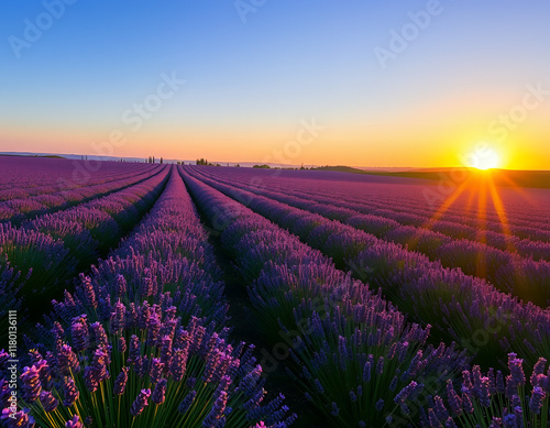 Naklejka premium The vibrant purple lavender flowers create a breathtaking landscape as the sun sets over the field in Provence