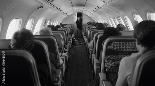 Fototapeta premium The view captures the aisle between rows of passenger seats aboard an...