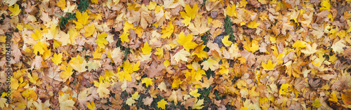© goodmoments, Obraz premium The view from above on the bright autumn foliage of maple falling from the tree. Autumn concept. wide view