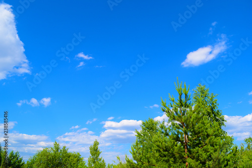 Obraz premium The view from below through the green plants to the sky is blue with clouds....