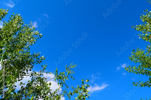 © YAROSLOVEPHOTOVIDEO, Obraz premium The view from below through the green plants to the sky is blue with clouds. Texture.