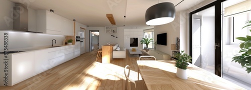 Fototapeta premium The view from the balcony in Neubau Apartment has a panorama of the inside of the penthouse with its kitchen and sofa