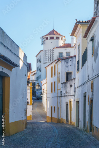 Fototapeta premium The view of narrow paved street of Evora with the cozy white and yellow...