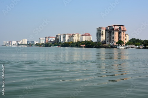 Naklejka premium The view of the Marine Drive in Ernakulam and Cochin Port or Kochi Port on...