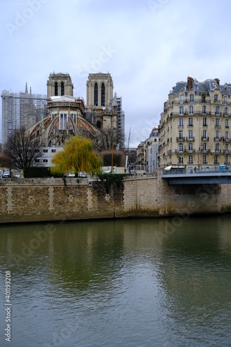 Naklejka premium The view of the rear of Notre Dame during huge repair works. 21 december 2020 - Paris