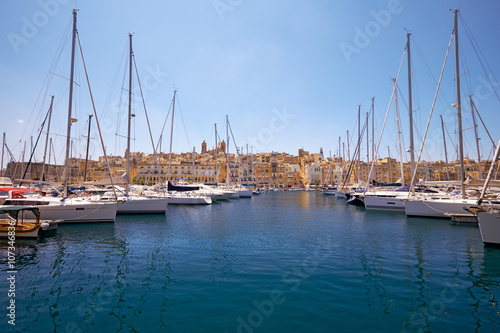 © Serg Zastavkin, Fototapeta premium The view of yachts moored in harbor in Dockyard creek with Sengl