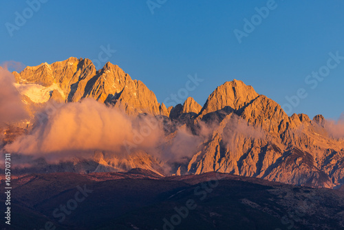 © 大 李, Naklejka premium The view of Yulong Snow Mountain bathed in sunlight on the golden Mountain