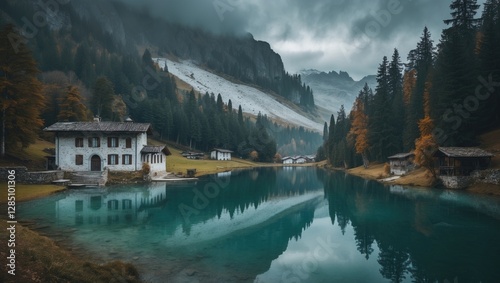 Fototapeta premium The village of Anaunia in Italy features a quaint alpine lake surrounded by...