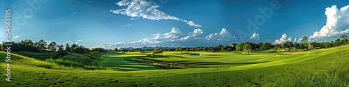 Fototapeta premium The Villages Golf Landscape Panorama Over Green Grass Field in Florida