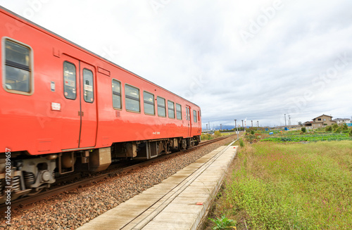 © MMxeon, Fototapeta premium The vintage orange train going out from platform after boarding people for transportation, Japan.