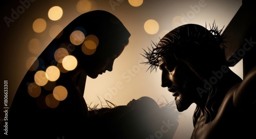 © Светлана Воротняк, Obraz premium The Virgin Mary holding baby Jesus and man Jesus on the cross, representing the birth and passion of Christ. Christian religion concept.