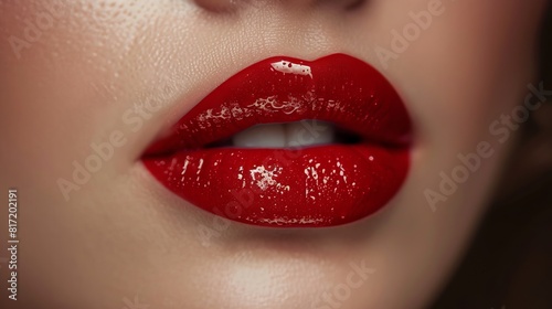 Obraz premium The voluptuous lips of a woman Accessorize with glossy red lipstick. The bright red color stands out. With a plastic shine that adds a unique and enchanting quality to the image.