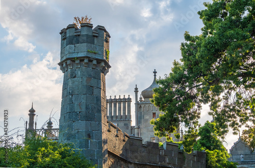 © Dmitrii Potashkin, Fototapeta premium The walls and towers of the old palace on the background of a blue sky at sunset