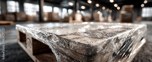 © Prasanth, Fototapeta premium The warehouse pallet snugly covered with transparent shrink wrap film