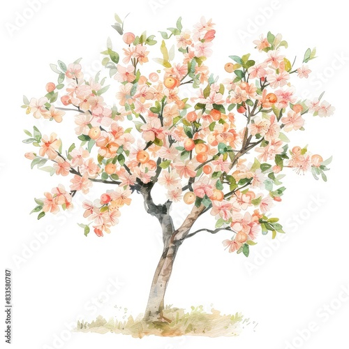Fototapeta premium The watercolor painting of a peach tree in full bloom