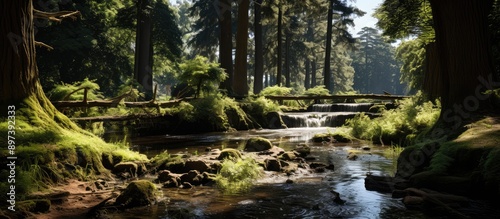 Obraz premium The waterfall in the middle is beautiful and surrounded by naturally cool trees