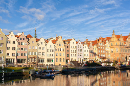 Naklejka premium The waterfront in Gdansk, Poland. Buildings and the river under bright skies....