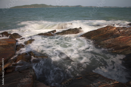 Fototapeta premium The waves breaking on a stony beach, forming a spray in Thailand