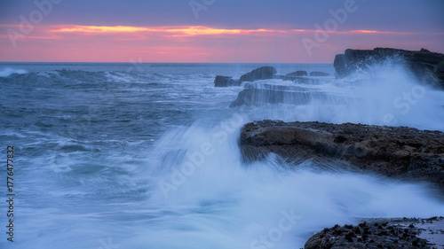 Fototapeta premium The waves crash against the rocky coast