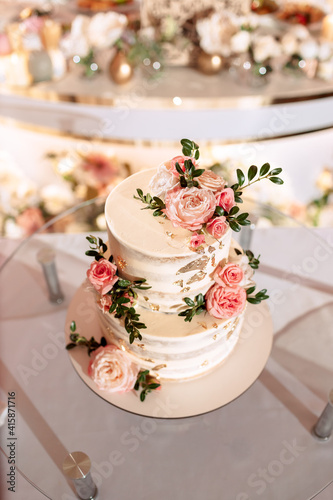 Fototapeta premium The wedding cake. White, two-tiered, decorated with flowers and gold. On a...