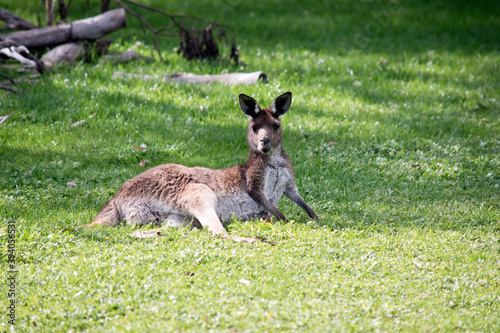 Fototapeta premium The western grey kangaroo is resting on the grass