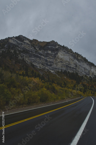 © Bric, Fototapeta premium The wet road on mountain side under the rocky granite peaks in utah.