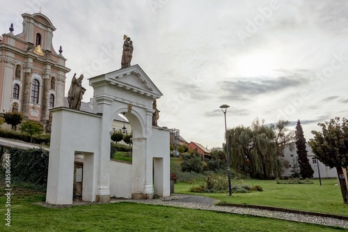 © mino21, Naklejka premium The white baroque entrance gate in Fulnek, Czech Republic with a Kostel Nejsvetejsi Trojice (Holy Trinity Church) in background