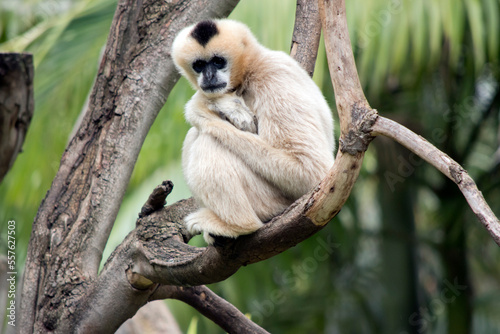 Fototapeta premium the white cheeked monkey is perched high in a tree