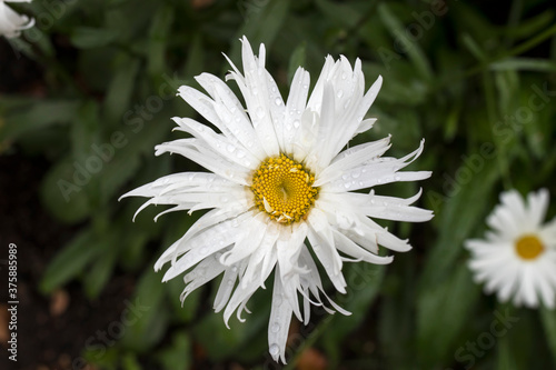 Obraz premium The white daisy on a green background in the garden