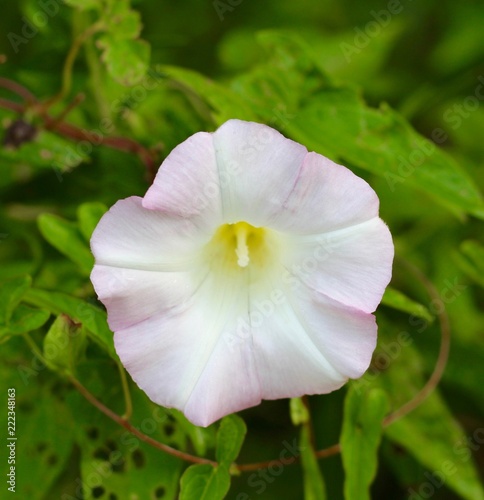 Fototapeta premium The white purplish flower on the shrub and a close view.